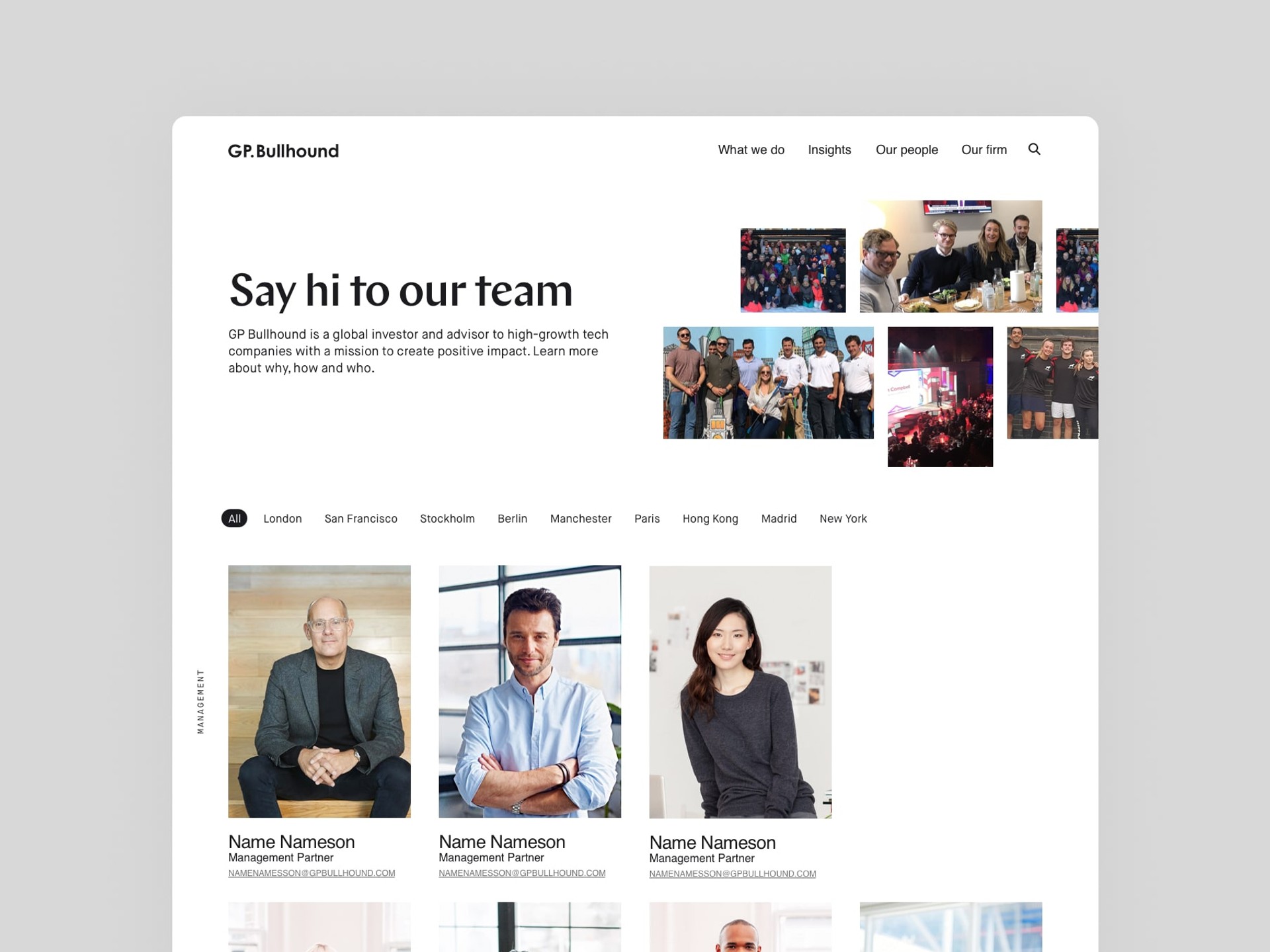 Nettstedet ble så det primære uttrykket for den reposisjonerte merkevaren. Dynamisk, brukersentrert og bygget for å engasjere klienter, partnere og interessenter på tvers av alle markeder hvor GP Bullhound opererer. En plattform som viser frem ikke bare tjenester, men en ekte forpliktelse til teknologi-økosystemet — gjennom forskning, innsikt og historiene om selskapene de har hjulpet å bygge.